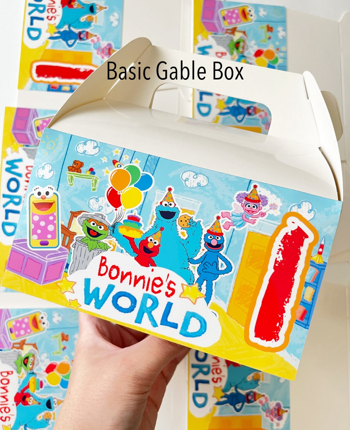 Basic Gable Boxes - They are decorated with a flat printed image across the front of the box. Boxes are personalized with birthday child’s name and age (If you’d like multiple names there will be an additional fee).