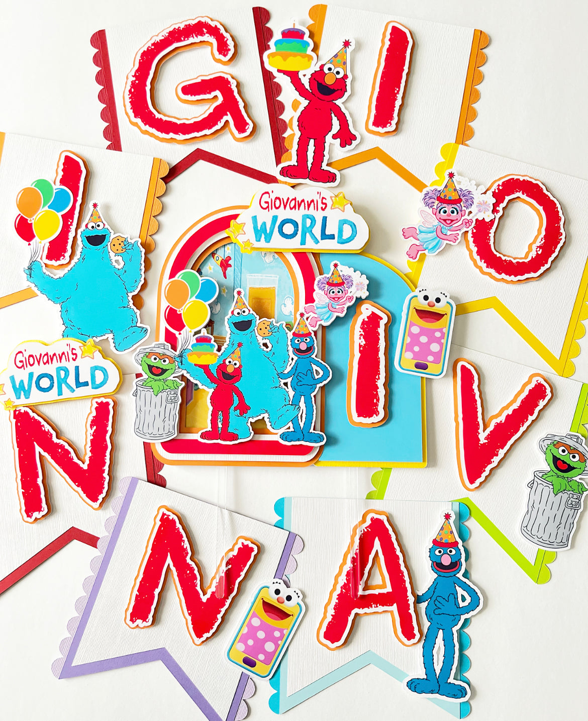 Party Package includes happy birthday banner with name (up to 9 letters), cake topper, and 24 cupcake toppers.
