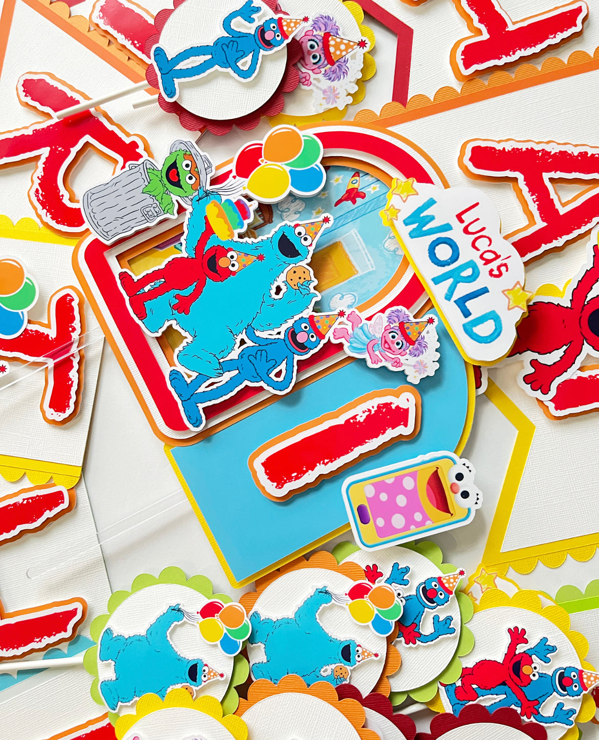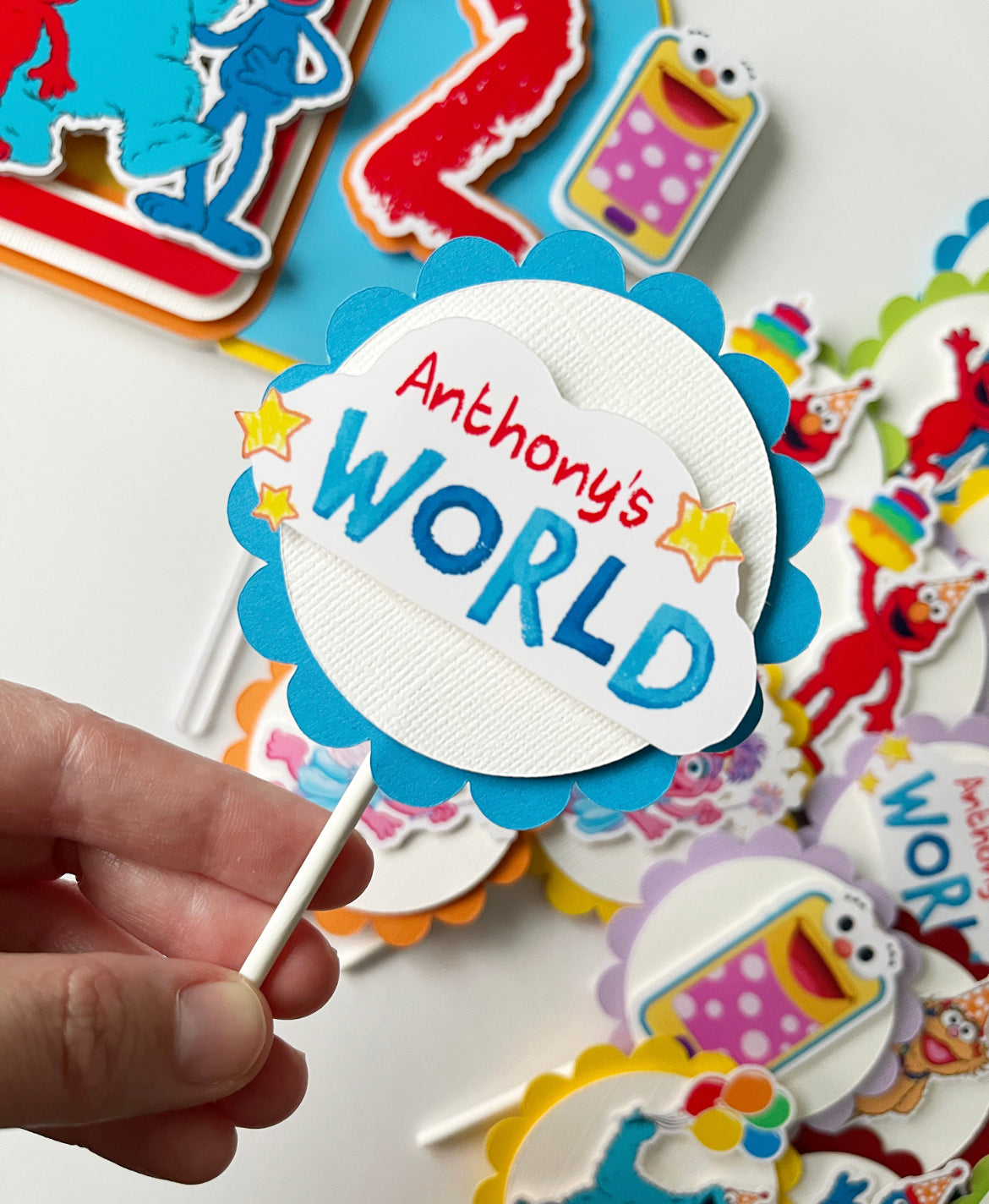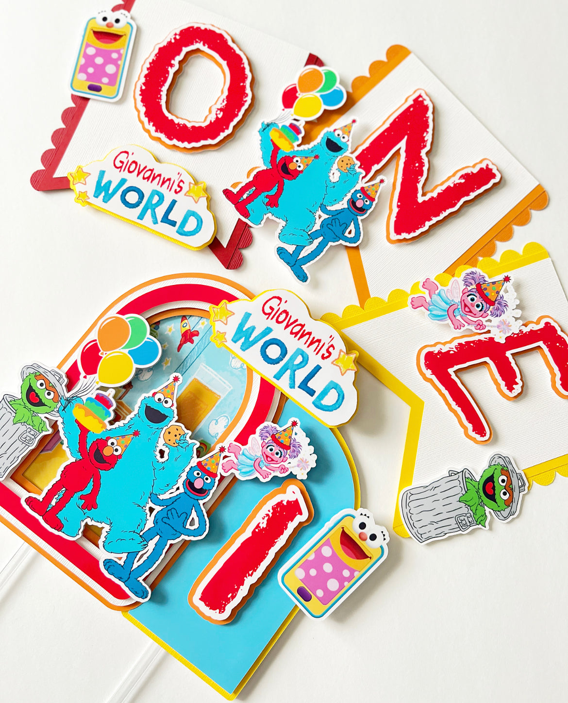 Cake topper/Cupcake Toppers are made up of a combination of printed images and Cardstock paper cut outs. They are popped with foam to give a 3D layered look. Overall size of cake topper is approx 8"Wx8"H.