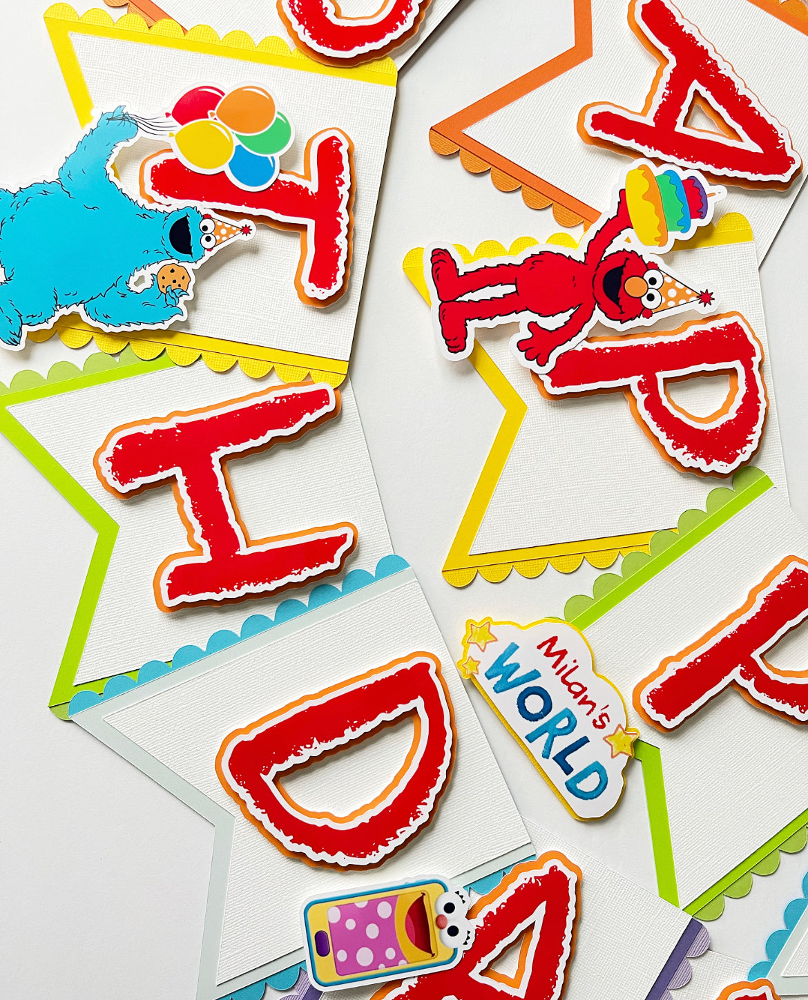 Overall size of banner depends on the type chosen. Each flag measures approximately 5"W by 5.5"H. Banner is made up of a combination of printed images and Cardstock paper cut outs. It is popped with foam to give a 3D layered look.