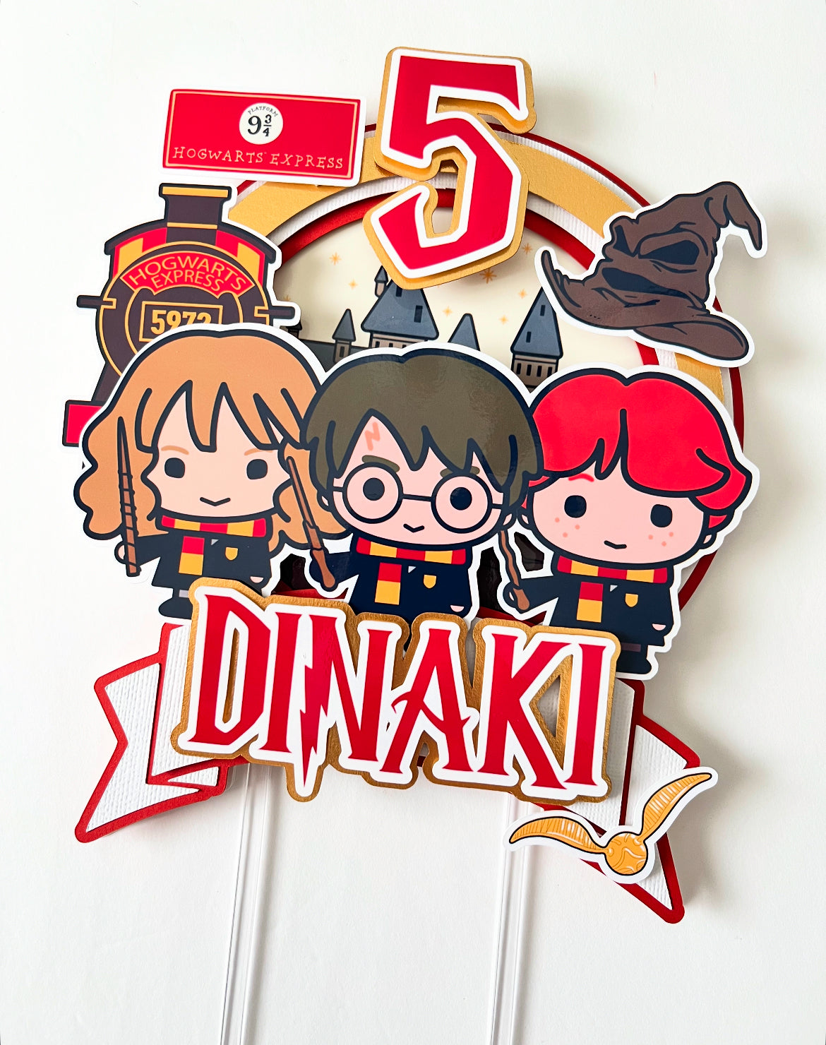 Cake topper is made up of cardstock paper and printed images. It is popped with foam to give a 3D layered look. Topper comes with an acrylic stick. Topper is made for an 8 inch cake.