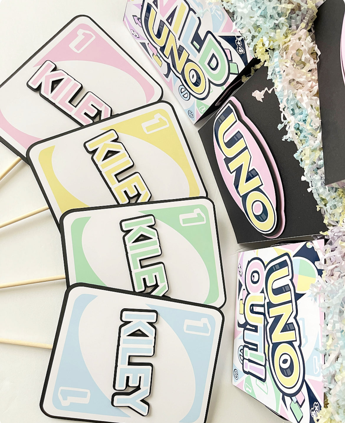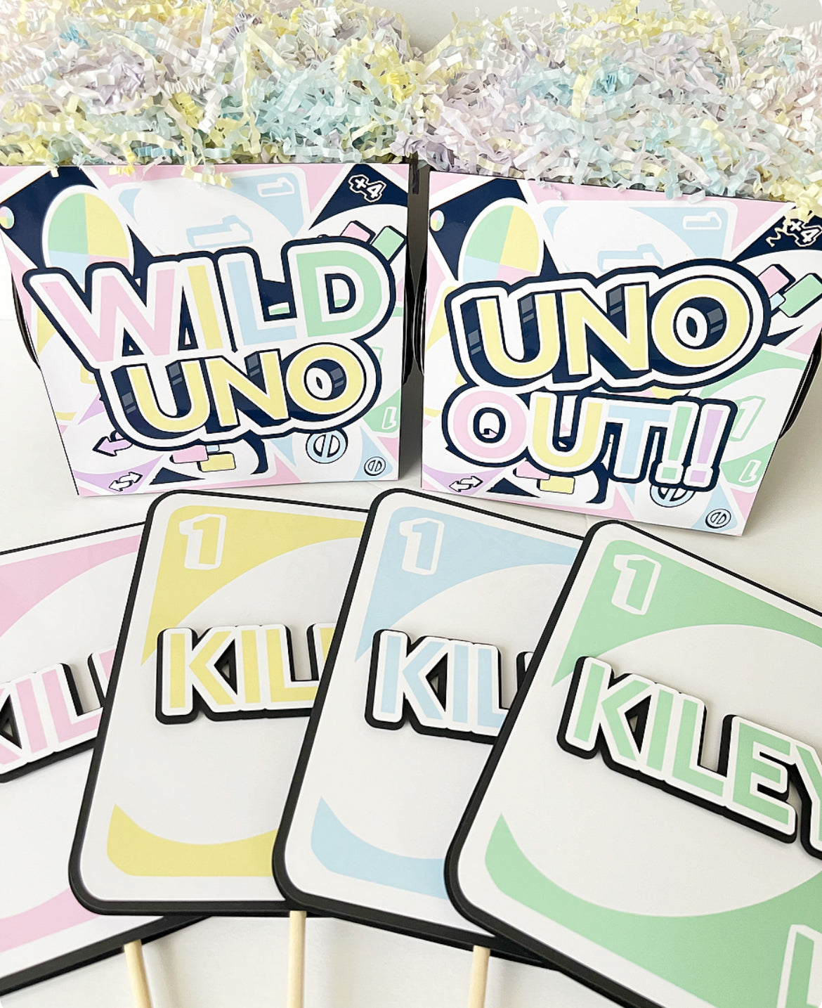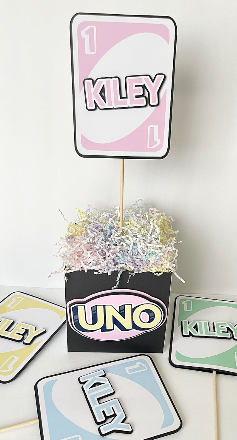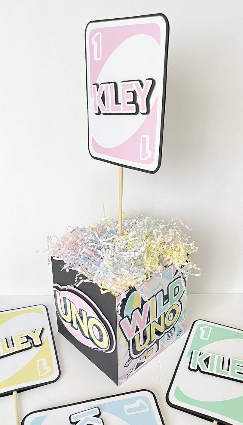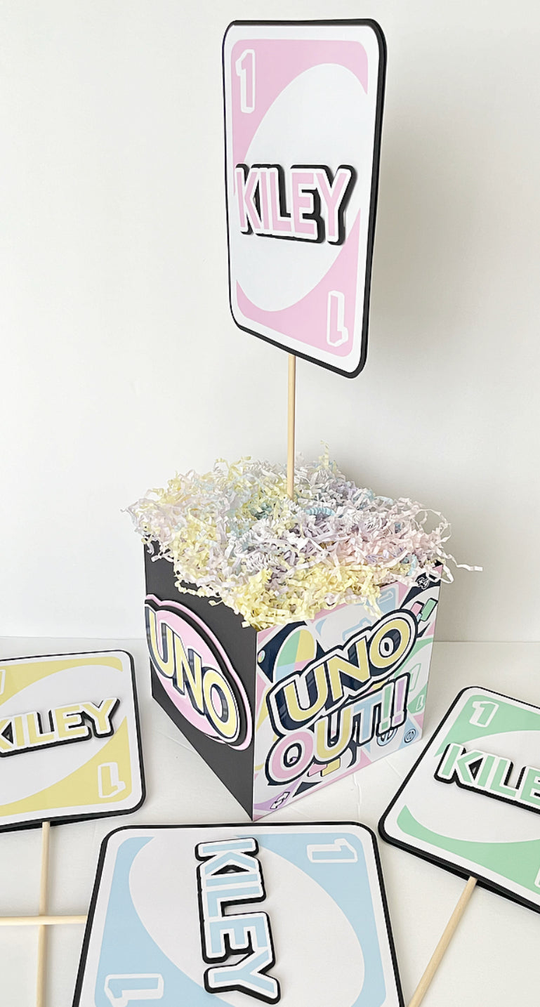***Centerpieces will be made in traditional UNO colors unless pastels are requested in the special instructions box at checkout. Also, the sides of the box where you see uno out and wild uno will be a flat printed image as seen on the pastel centerpieces. Only the front and back of the box will be 3D.***